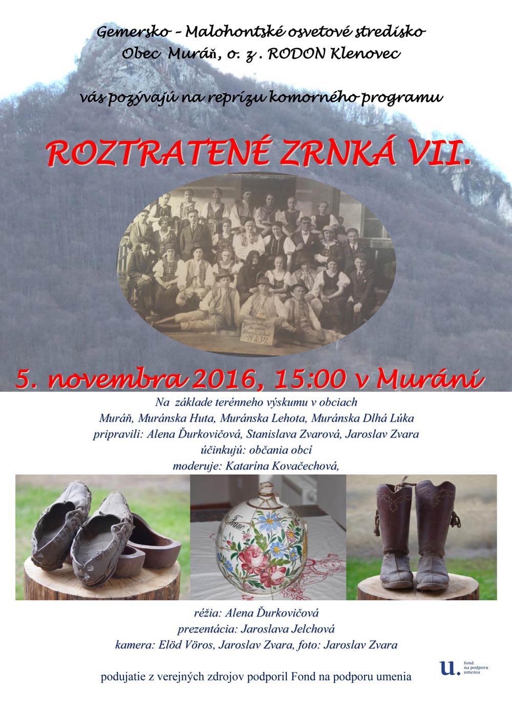 Tento rok sa tím Roztratených zrniek v zložení Alena Ďurkovičová, Jaroslav Zvara, Stanislava Zvarová zameral na rázovitý kraj Slovenského Rudohoria, pod Muránskym hradom v okrese Revúca v obciach Muráň, Muránska Dlhá Lúka, Muránska Huta a Muránska Lehota. Na základe terénneho výskumu tím spracoval materiál pre verejnú prezentáciu, aby v spolupráci so starostami, informátormi, fotografom, kameramanom, aj tento rok vznikol komorný program. Jeho premiéru mohli diváci ako každoročne vidieť na Gemersko – malohontských folklórnych slávnostiach - Klenovská Rontouka. Repríza komorného programu bude najbližšie v mieste výskumu a to v obci Muráň už túto sobotu, 5. novembra o 15:00, v kultúrnom dome. V programe sa predstavia informátori zo skúmaných obcí, a to: Eva Struhárová, Margita Sklenáriková, Emília Labošová, Margita Domániová, Marta Šutičová, Mária Machová, František Oravec, Anna Zajačková, Gizela Beňová, Pavel Štefaňár. Spevácka skupina Levenda z Muráňa. Réžia programu Alena Ďurkovičová, príprava Jaroslav a Stanislava Zvarovci. Prezentácia Jaroslava Jelchová, kamera Elöd Vörös.
