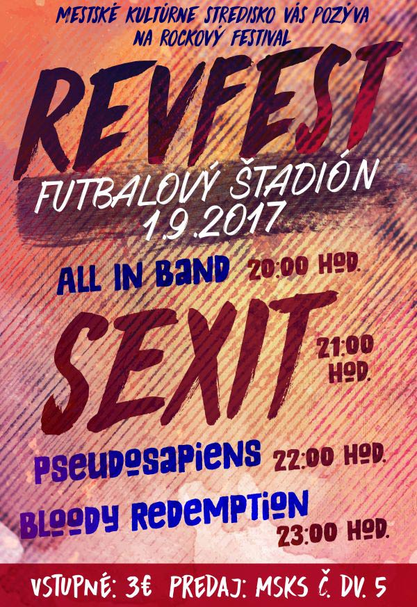 Hudbu si v piatok večer dosýta užijete aj v Revúcej. Tamojšie Mestské kultúrne stredisko pripravilo rockový festival s názvom RevFest, kde sa predstavia All in Band, Sexit, Pseudosapiens, Bloody Redemption. Vstupné je 3 euro.