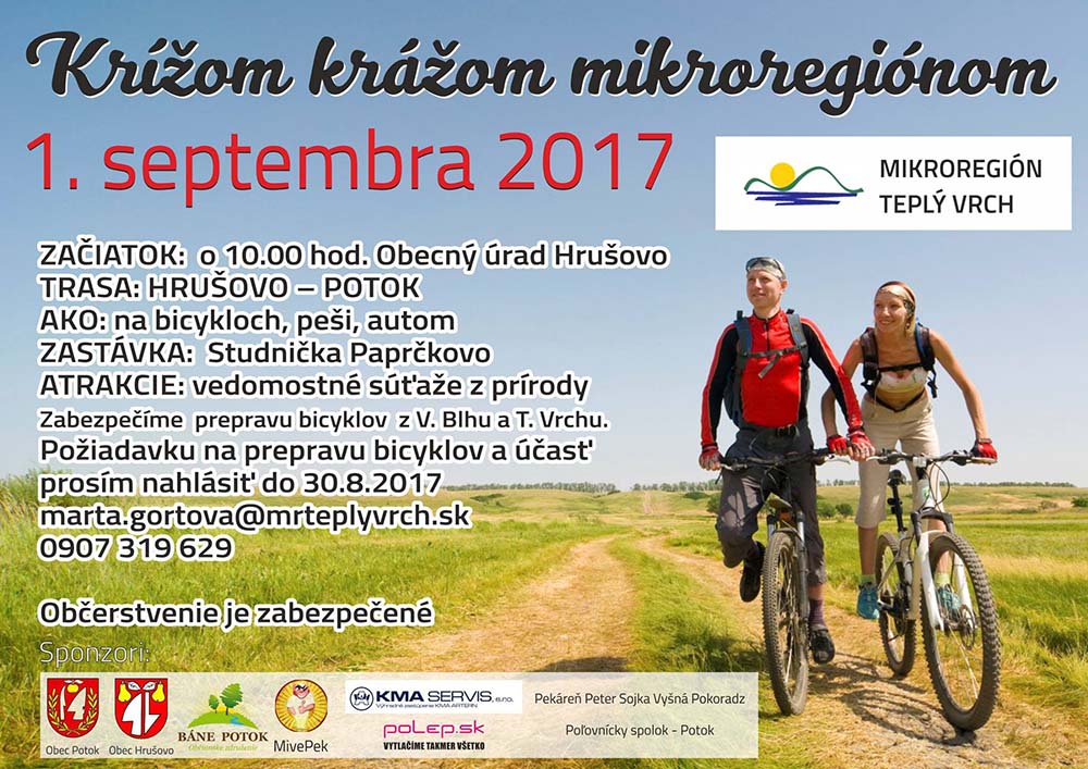 Zajtrajší voľný deň, 1. septembra, ktorému bude priať i počasie môžete stráviť poznávaním mikroregiónu Teplý Vrch. Postará sa o to akcia Krížom krážom mikroregiónom, ktorá povedie od obce Hrušovo na Potok. Ako ďalej pre Rimava.sk uviedla manažérka Mikroregiónu Teplý Vrch Marta Gortová, pre cyklistov s rodinami aj tento rok zvolili originálnu trasu. Merať bude viac ako šesť kilometrov. „Aby mohli počas voľného dňa zmysluplne tráviť čas deti, rodičia aj starí rodičia,“ povedala manažérka. Čaká vás aj spoznávanie prírody, a to napríklad hrami alebo súťažami v spoznávaní listov jednotlivých stromov. Popoludnie bude podľa organizátorov vyhradené pre deti, i pre vedomostné a športové súťaže. „Všetky deti budú odmenené,“ dodala Gortová.
