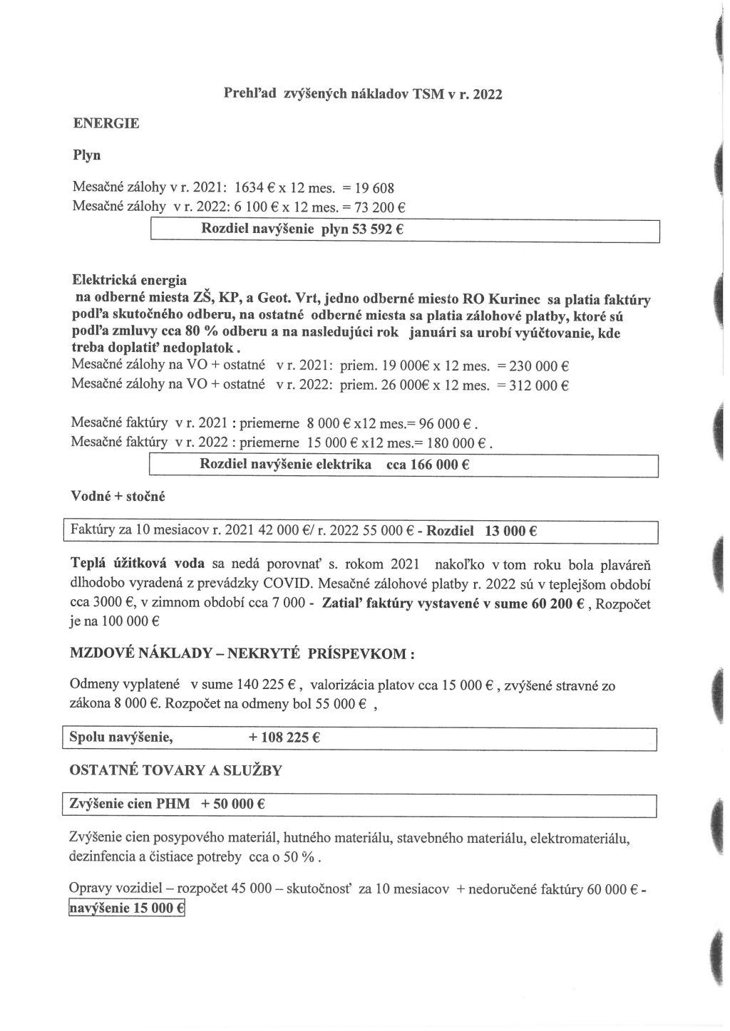 Ako vyplýva zo zverejneného prehľadu, stúpli im napríklad náklady na plyn o cca 53-tisíc eur, elektrickú energiu o cca 166-tisíc eur, mzdové náklady (aj odmeny zo zákona) o cca 108-tisíc eur, náklady na pohonné hmoty o 50-tisíc eur a atď. Spolu tieto zvýšené náklady tvoria sumu 406-tisíc eur.