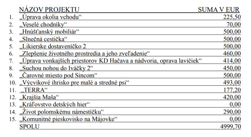 HNÚŠŤA - Poslanci mestského zastupiteľstva v Hnúšti schválili financovanie 13-tich projektov, ktoré sa zapojili do participatívneho rozpočtu. Celkovo bolo na to vyčlenených 5 000 eur.