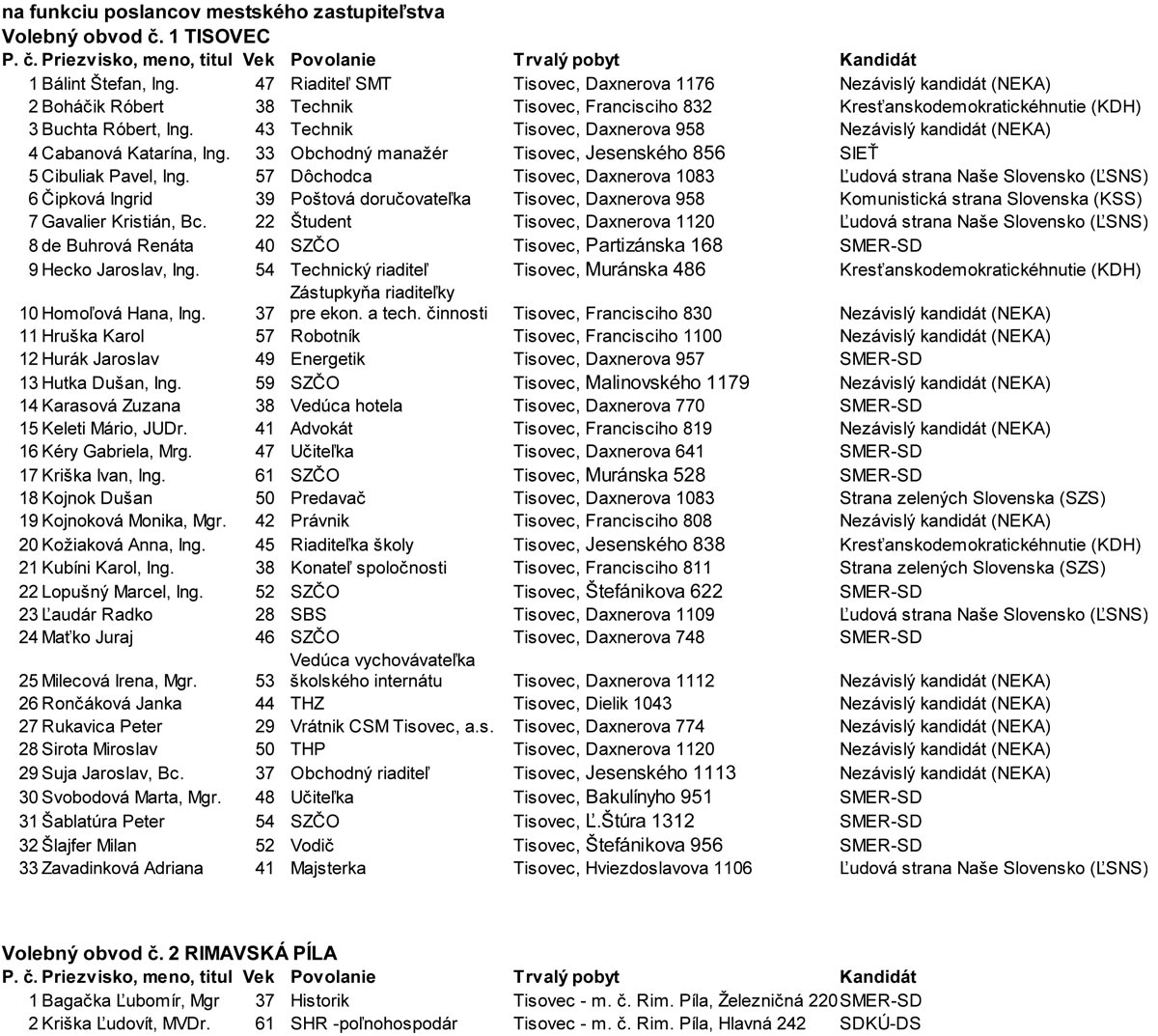 Obyvatelia Tisovca si v novembrových komunálnych voľbách vyberú spomedzi 35 kandidátov jedenástich zástupcov – poslancov mestského zastupiteľstva, desiatich vo volebnom obvode Tisovec, jedného v obvode Rimavská Píla. Ako samospráva informuje, volebná komisia nezaregistrovala jedného politického kandidáta za politickú stranu Úsvit z dôvodu nesprávne podanej kandidátnej listiny. Kandidátna listina obsahovala splnomocnenca a náhradníka politickej strany, ktorou bol kandidát politickej strany, pričom podľa zákona kandidát nemôže byť splnomocnencom ani náhradníkom, uvádza volebná komisia.