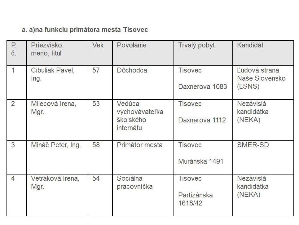 Dve ženy a dvaja muži vstúpia do volebného súboja o primátorské kreslo v meste Tisovec na severe Rimavskosobotského okresu. Mestská volebná komisia na svojom piatkovom zasadnutí zaregistrovala aj 35 kandidátov na poslancov mestského zastupiteľstva.