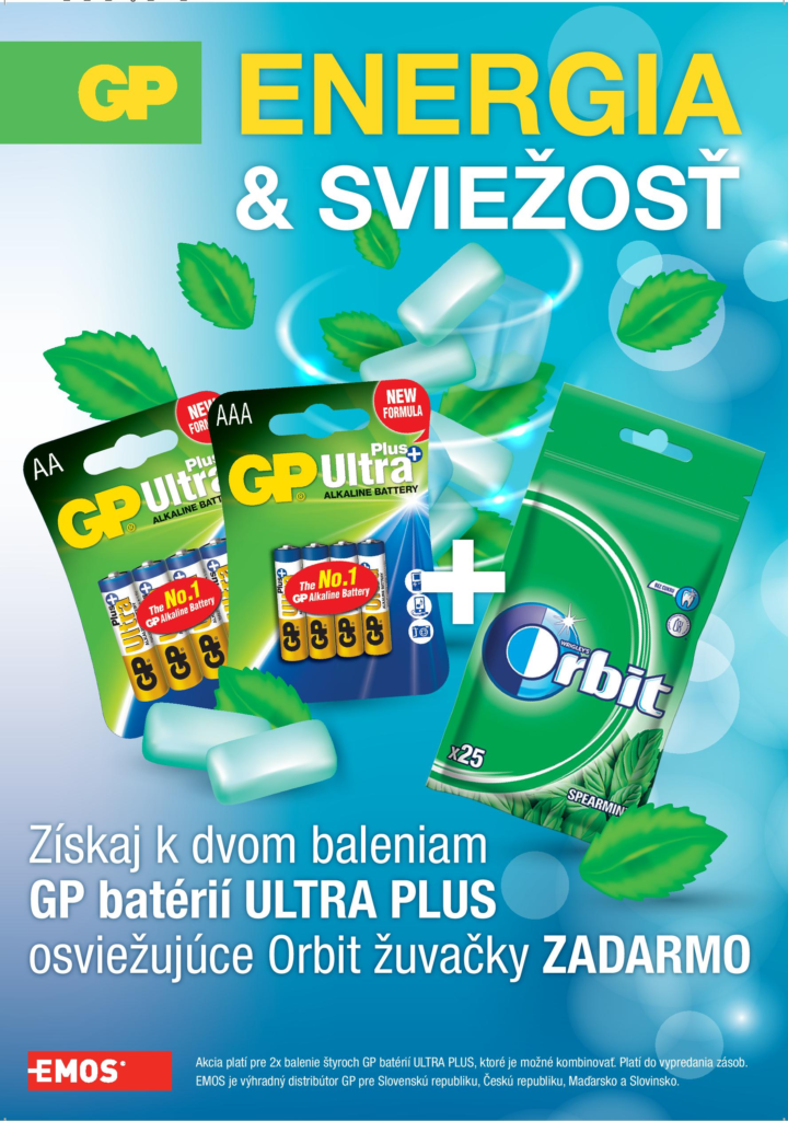 Navyše, ak v predajni nakúpite od štvrtka 1. júla, dostanete pri kúpe dvoch balení batérií GP ULTRA PLUS milý darček. 25-kusové balenie žuvačiek Orbit 25 ZDARMA!