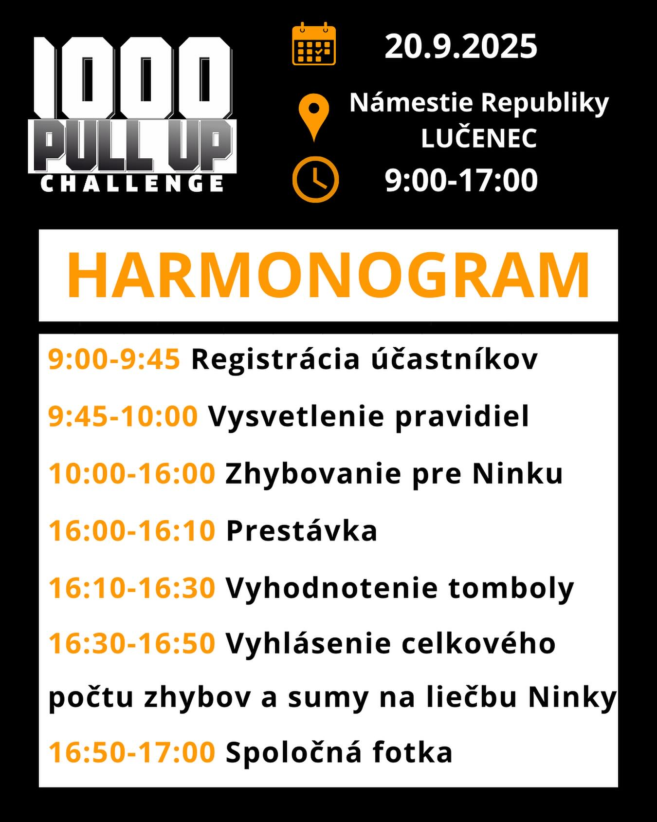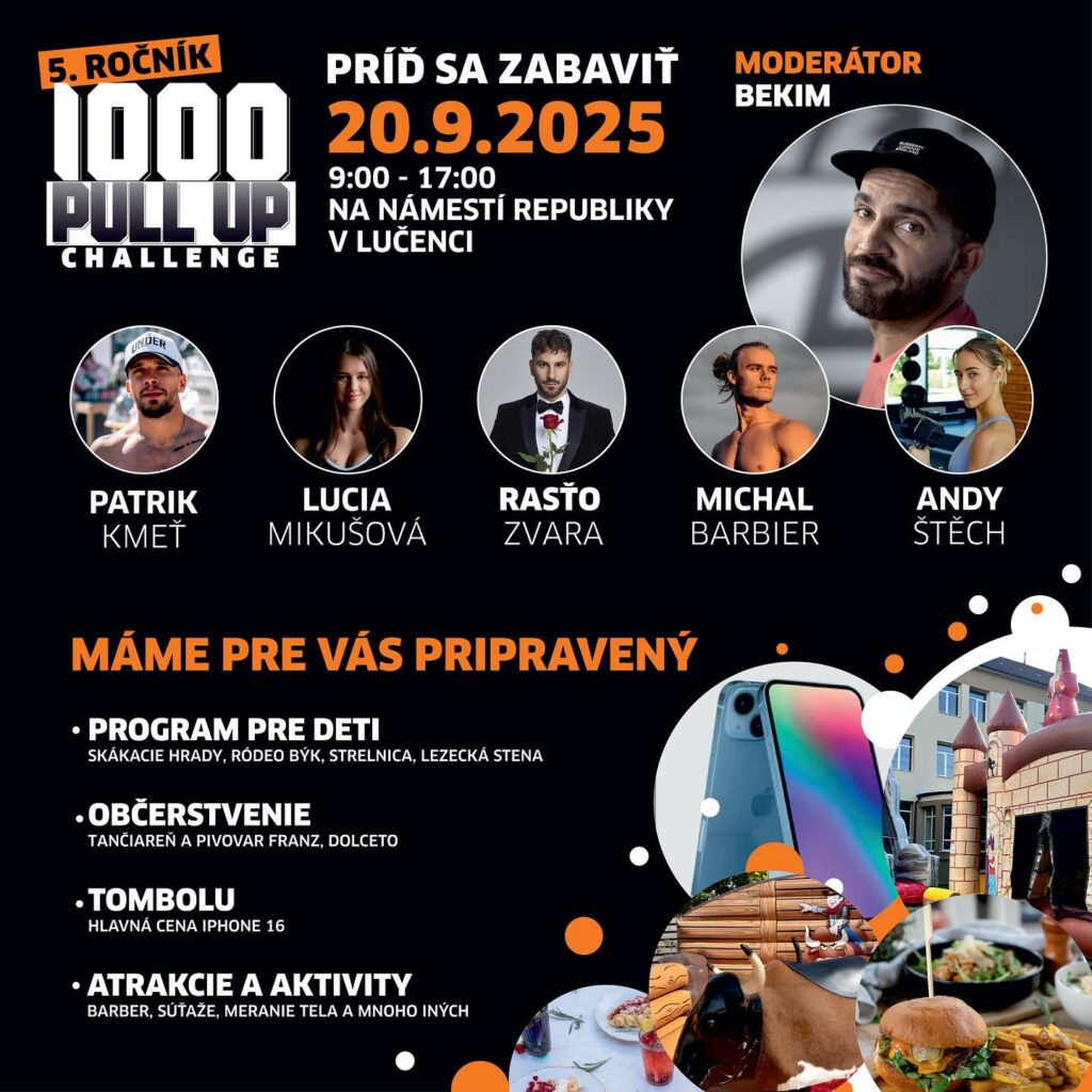 V sobotu 20. septembra 2025 sa Námestie republiky v Lučenci stane dejiskom piateho ročníka športovo-charitatívneho podujatia 1000 Pull Up Challenge. V čase od 9:00 do 17:00 hodiny si tu prídu na svoje nielen športovci, ale aj rodiny s deťmi, ktoré čaká deň plný pohybu a zábavy.