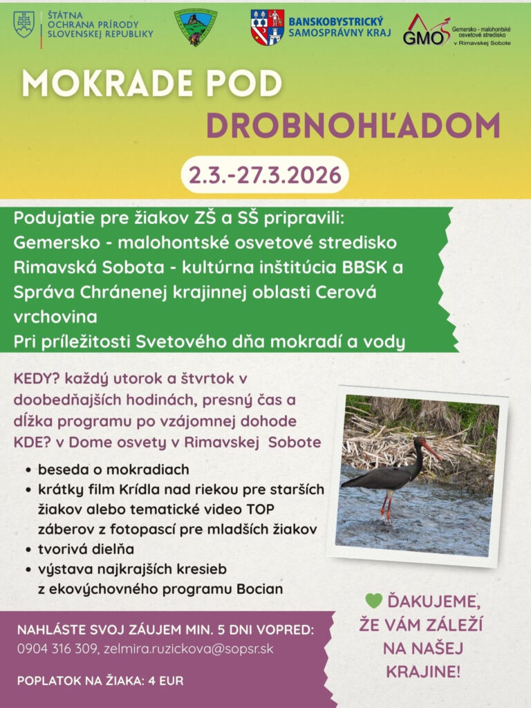 V čase, keď mokrade po celom svete čelia vážnym hrozbám a ich rozloha sa dramaticky zmenšuje, prichádza Gemersko-malohontské osvetové stredisko v Rimavskej Sobote spolu so Správou Chránenej krajinnej oblasti Cerová vrchovina s výnimočnou iniciatívou. Pri príležitosti Svetového dňa mokradí pripravili pre žiakov základných a stredných škôl podujatie "Mokrade pod drobnohľadom", ktoré bude prebiehať od 2. do 27. marca 2026.
