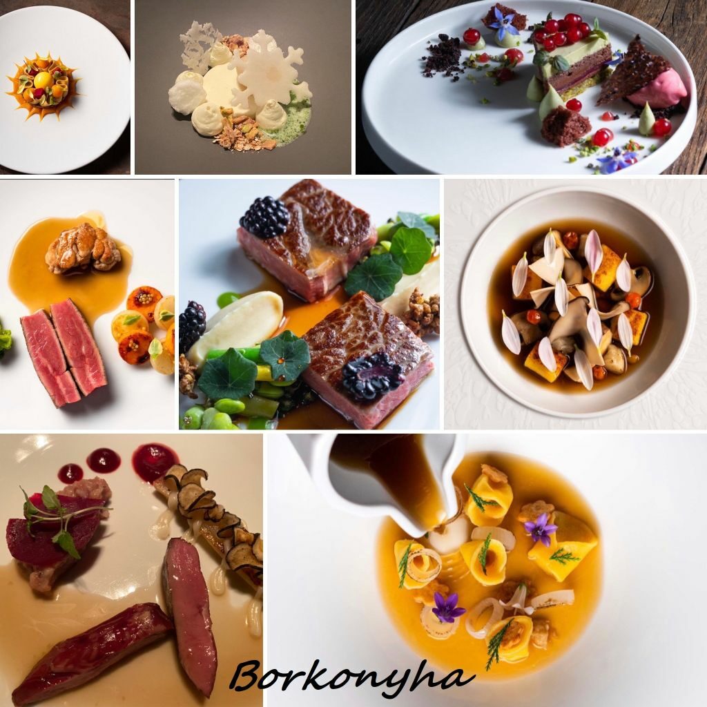 Degustačné menu v reštaurácii Borkonyha pozostáva z nasledovných chodov: predjedlo – jeseter, reďkovka, relish z chrenu, kaviár z jesetera a grapefruitové želé; druhé predjedlo: šúľance s lesnými hubami, vajce na hľuzovke, ľadový šalát; hlavné jedlo – holubie prsíčka a stehienka, údená cvikla, čierne ríbezle; druhé hlavné jedlo - hovädzia sviečková a líčka, fazuľové pyré, paprikové textúry; dezert - biela čokoláda, kokos, repa  a petržlen.
