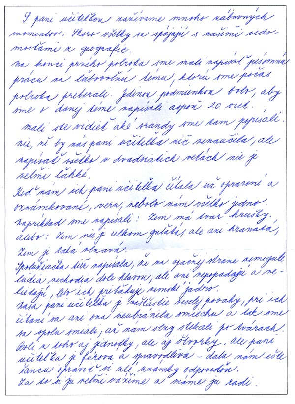Je mladá, milá, pekná a pracovitá. Vie aj zavtipkovať. Veľmi obľubuje všetko, čo sa týka Hello Kitty. Je kreatívna a na každej hodine sa niečo nové a zaujímavé naučíme.