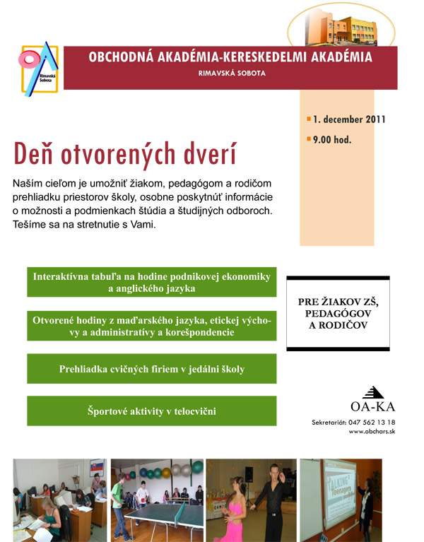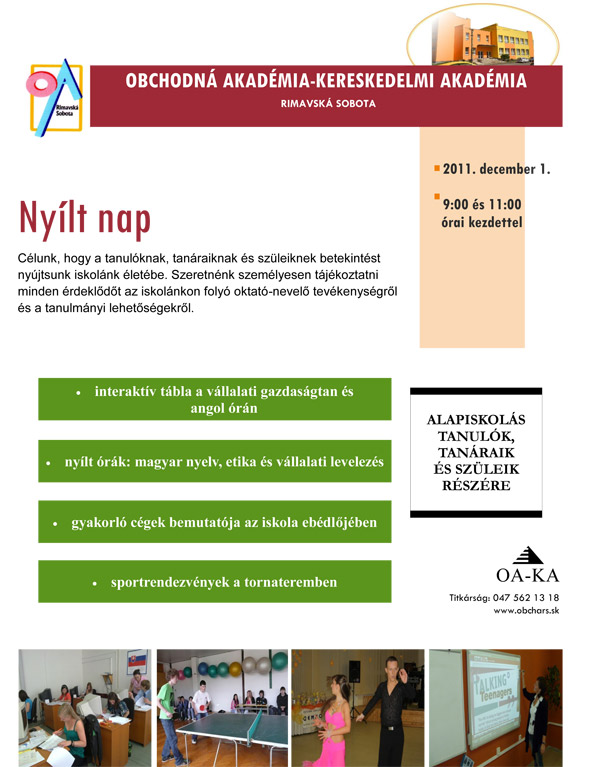 Pozrieť si priestory školy aj priebeh vyučovacích hodín a zároveň získať informácie o možnostiach a podmienkach štúdia budú môcť návštevníci rimavskosobotskej Obchodnej akadémie – Kereskedelmi akadémia v prvý decembrový deň. Od rána od 9.00 hod. vo štvrtok, 1. decembra, sa na škole uskutoční Deň otvorených dverí. Vítaní sú všetci žiaci základných škôl, ale aj rodičia, pedagógovia a tí, ktorí sa o Obchodnej akadémii chcú dozvedieť viac.