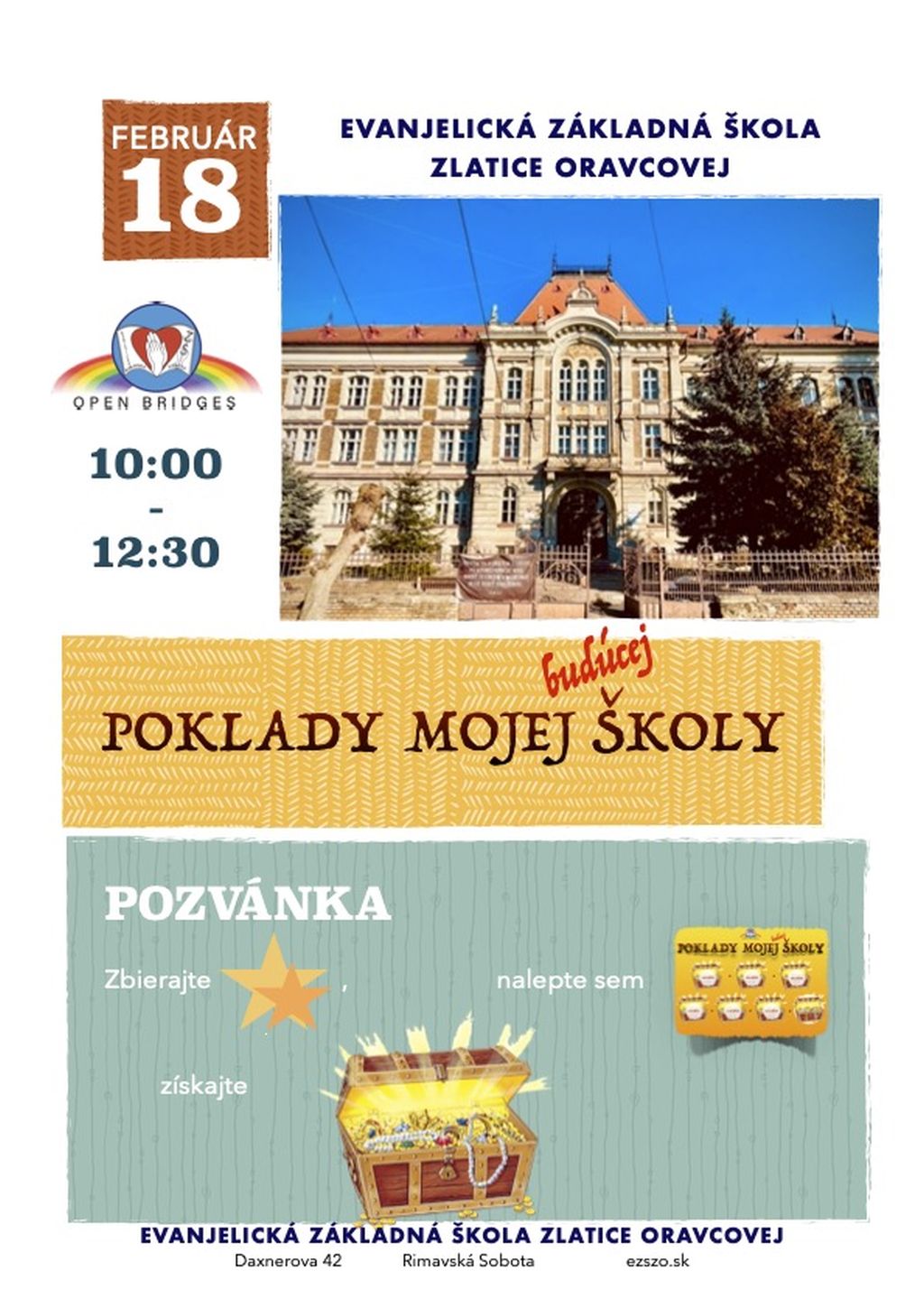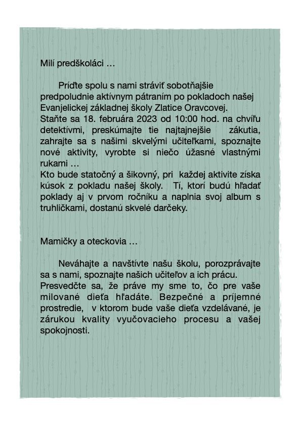 RIMAVSKÁ SOBOTA – Evanjelická základná škola Zlatice Oravcovej pozýva na podujatie s názvom Poklady mojej budúcej školy. Konať sa bude už túto sobotu 18. februára od 10.00 hod. Vítaní sú všetci predškoláci a ich rodičia.