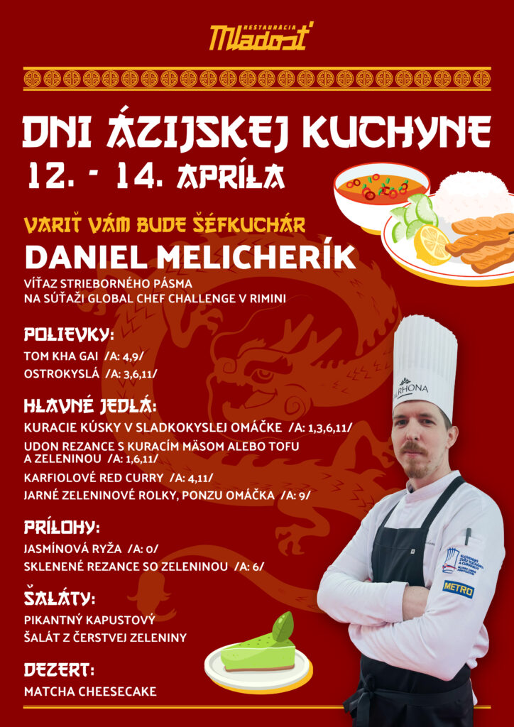 RIMAVSKÁ SOBOTA – Reštaurácia Mladosť na Železničnej ulici v Rimavskej Sobote, ktorá spadá pod krídla Strednej odbornej školy obchodu a služieb (SOŠOS), vás 12. až 14. apríla privíta so špecialitami z ázijskej kuchyne.