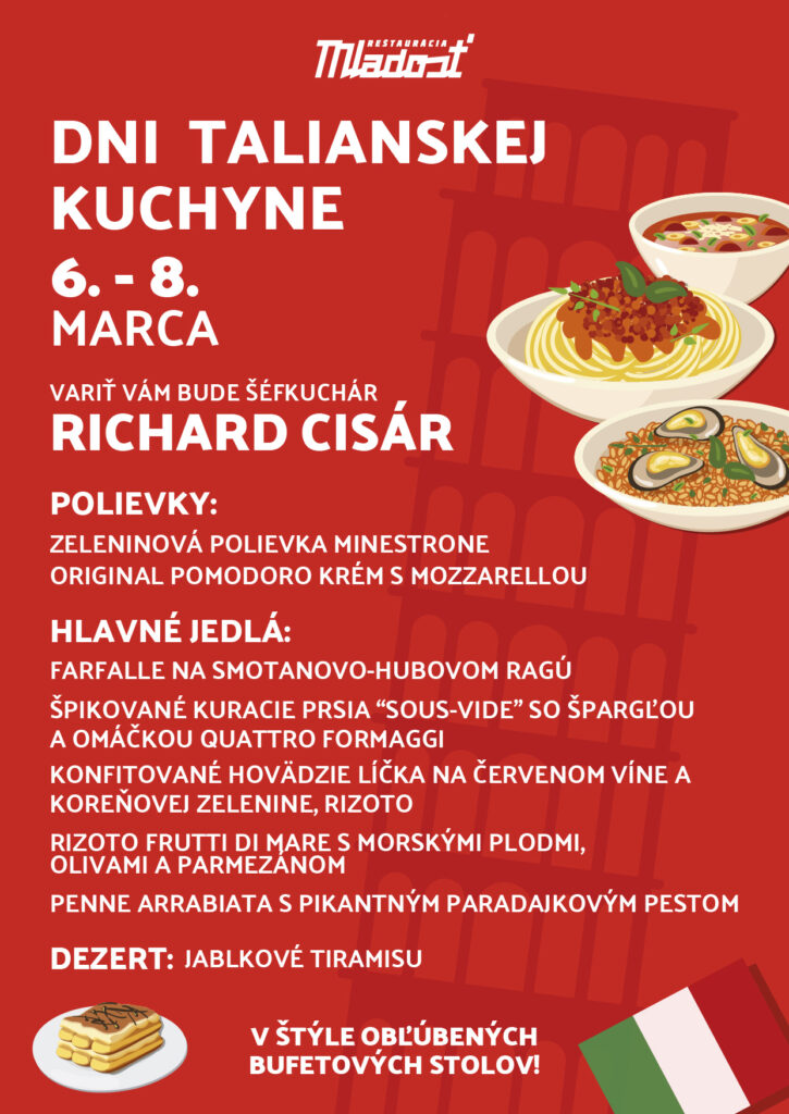 RIMAVSKÁ SOBOTA – Reštaurácia Mladosť na Železničnej ulici v Rimavskej Sobote, ktorá spadá pod krídla Strednej odbornej školy obchodu a služieb (SOŠOS), vás v týchto dňoch (6. – 8. marca) privíta so špecialitami z talianskej kuchyne.