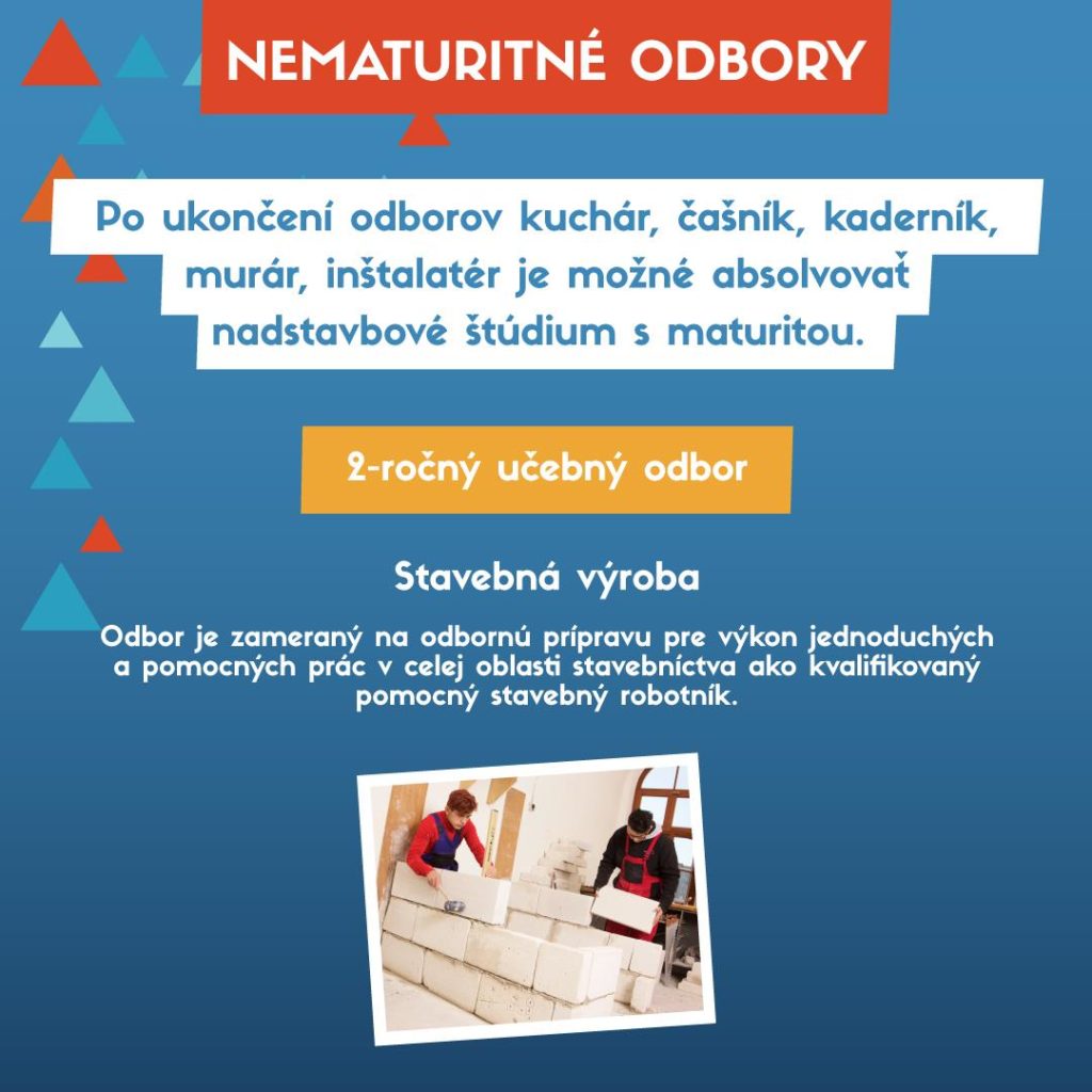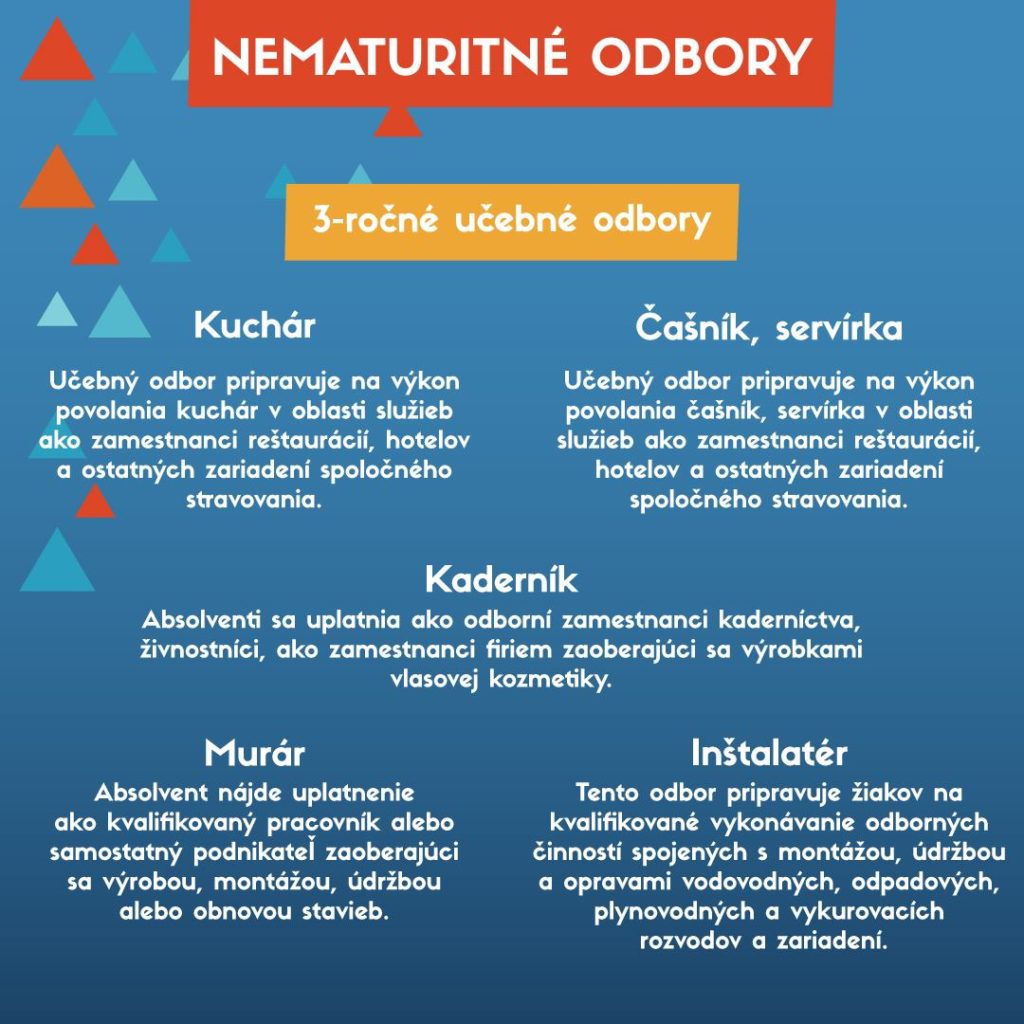 Nematuritné odbory – 3-ročné učebné odbory kuchár, čašník/servírka, kaderník, murár, inštalatér