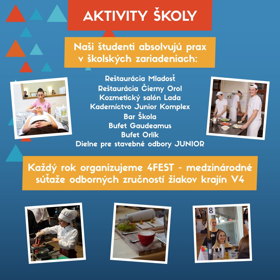 Stredná odborná škola obchodu a služieb poskytuje svojim žiakom okrem teoretických vedomostí aj potrebnú prax, ktorá pomáha pri prehlbovaní ich vedomostí. Zručnosti žiaci získavajú v školských zariadeniach Reštaurácia Mladosť, Reštaurácia Čierny Orol, Kozmetický salón Lada, Kaderníctvo Junior Komplex, Bar Škola, Bufet Gaudeamus, Bufet Orlík a v dielňach pre stavebné odbory Junior. Priestory týchto zariadení sa snaží každoročne obnovovať.