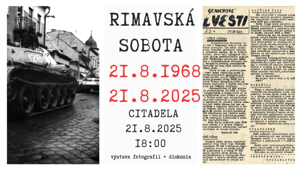 Tento rok si túto pamätnú udalosť pripomenieme osobitným stretnutím. Rimavská kaviareň vás pozýva vo štvrtok 21. augusta 2025 o 18:00 hod. na podujatie, na ktorom vystúpia Jozef Fodor a Mária Rybárová. Porozprávajú o tom, čo cítili, keď videli svoje mesto obsadzované cudzou armádou a ako tieto udalosti poznačili ich životy.