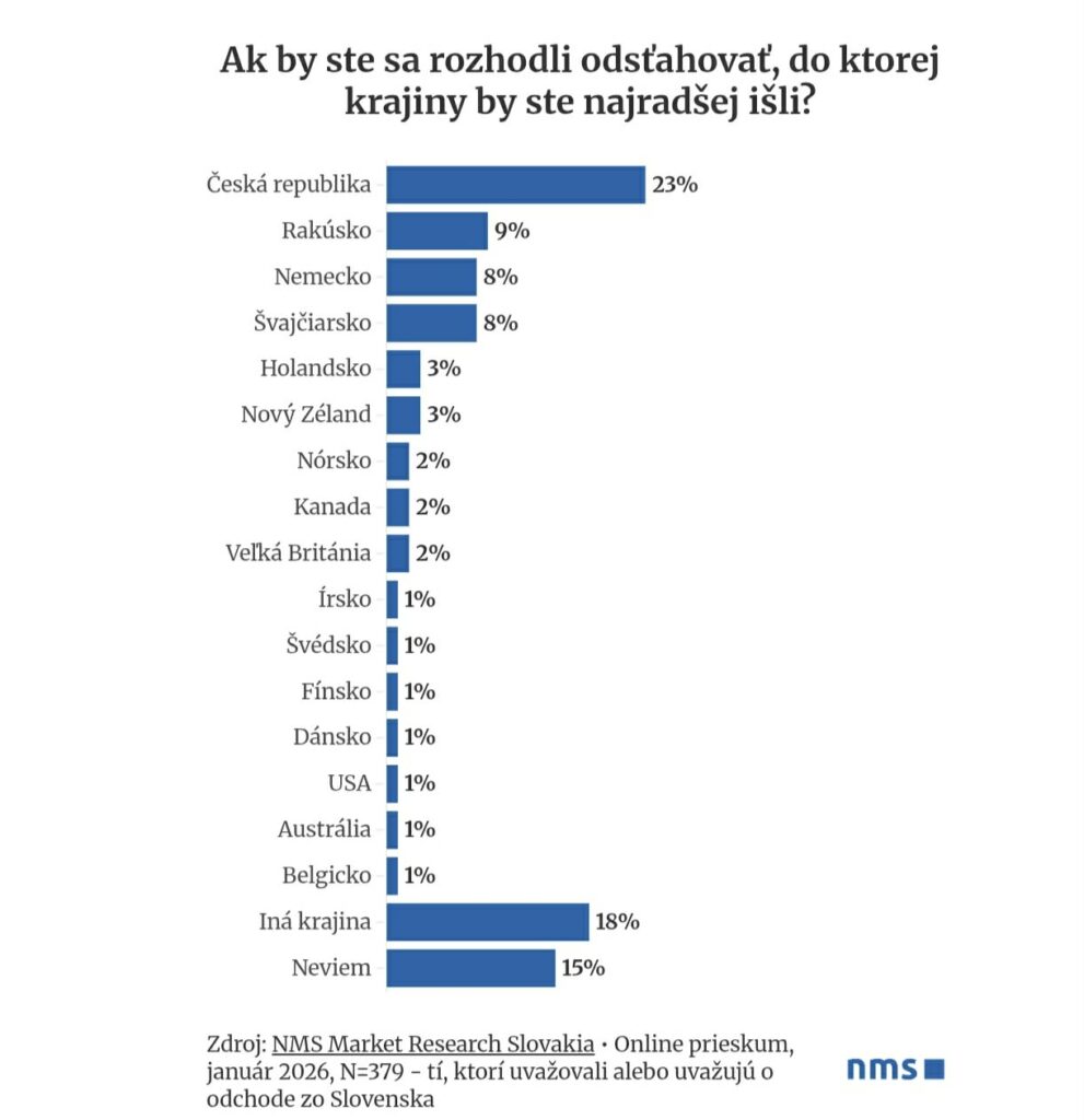 Ak by padlo definitívne rozhodnutie, cieľ je jasný. Česká republika dominuje u 23 % opýtaných. Je to logické – nulová jazyková bariéra a lepšie služby. Zaujímavé sú aj ďalšie destinácie: