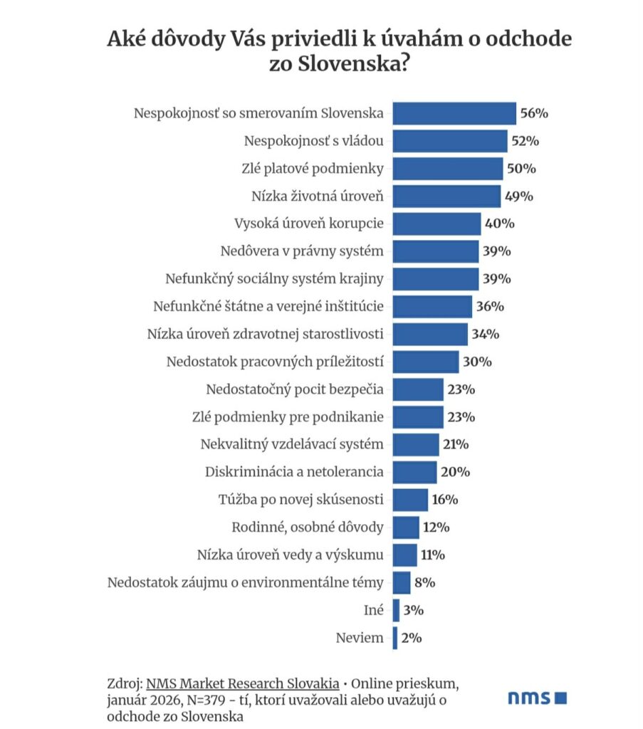 Zaujímavým zistením agentúry NMS je, že ľudí nevyháňa len prázdna peňaženka. Až 56 % opýtaných uviedlo ako dôvod nespokojnosť so smerovaním Slovenska a 52 % nespokojnosť s vládou.