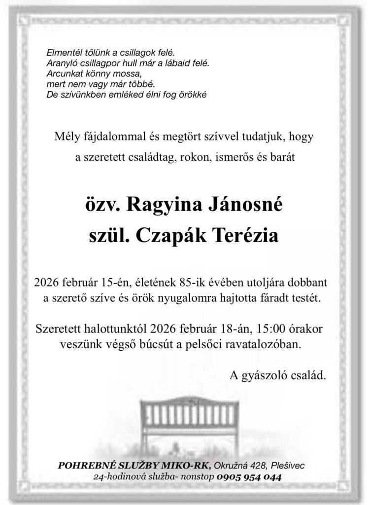 Smútočné oznámenie, Terézia Ragyinová, rod. Czapáková (†85)