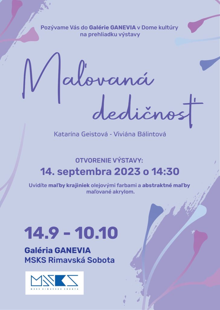 RIMAVSKÁ SOBOTA – Galéria Ganevia v rimavskosobotskom Dome kultúry vás pozýva na ďalšiu výstavu umenia, ktoré budú prezentovať Soboťanky Katarína Geistová a jej vnučka Viviána Bálintová. Autorky vám na vernisáži, ktorá sa uskutoční už vo štvrtok (14. septembra), predstavia svoje obrazy krajín, na ktoré použili techniky olejomaľby a maľovanie akrylom.