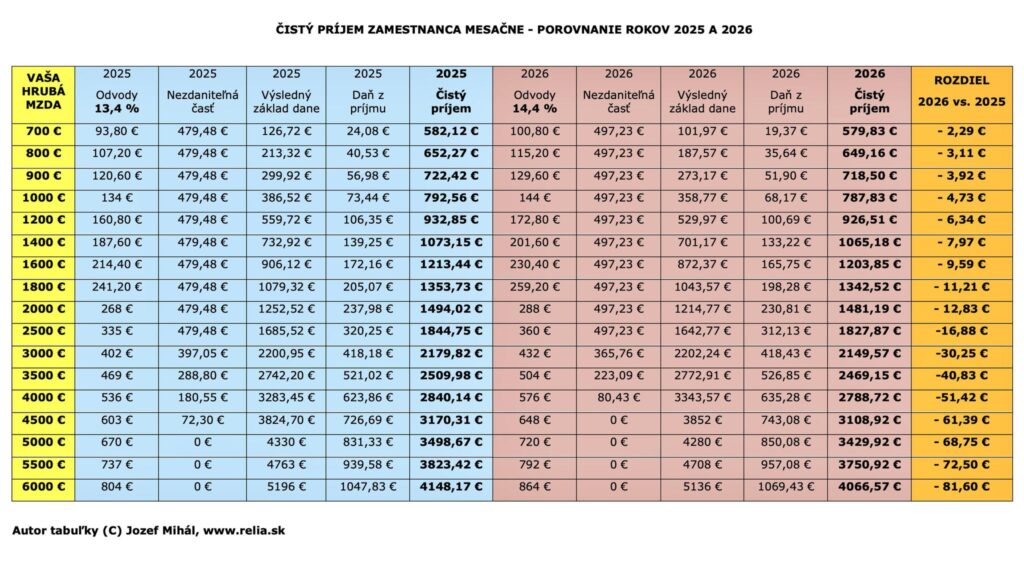 Ak zamestnávateľ medziročne nezvýšil hrubú mzdu, čistý príjem bude v porovnaní s minulým rokom nižší. Rozdiel je citeľnejší pri vyšších zárobkoch. Podľa prepočtov odborníka na sociálnu politiku Jozefa Mihála zamestnanec s hrubou mzdou 1 000 eur príde približne o 5 eur mesačne. Pri plate 1 500 eur ide už o pokles okolo 9 eur. Pri nadpriemerných príjmoch je rozdiel výraznejší – pri hrubej mzde 5 000 eur sa čistá suma znižuje o viac než 68 eur a pri 6 000 eurách presahuje pokles hranicu 80 eur.