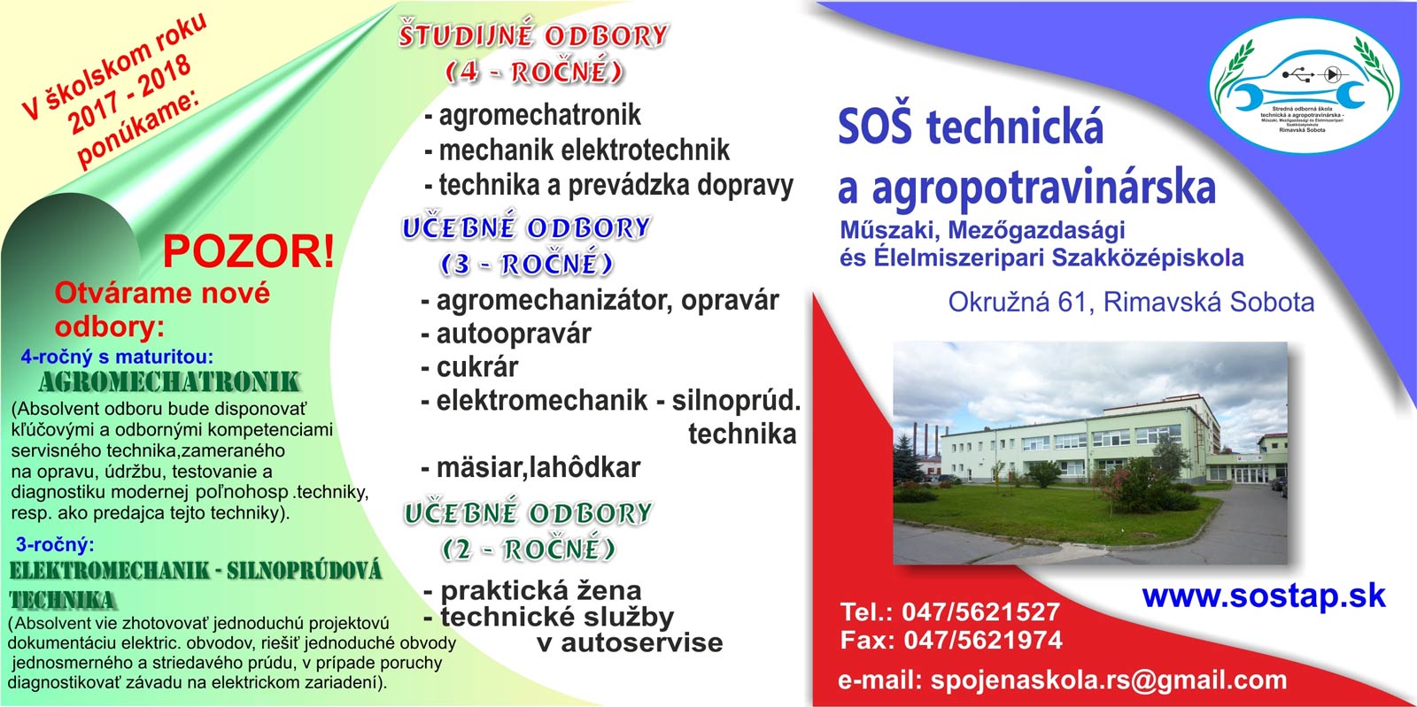sostap-perexStredná odborná škola technická a agropotravinárska (SOŠTaAP) na Okružnej ulici v Rimavskej Sobote už tradične sprístupňuje žiakom 9. ročníkov základných škôl, ich rodičom, ako aj širokej verejnosti svoje priestory v rámci Dňa otvorených dverí, aby sa mohli sami presvedčiť o vybavenosti školy a oboznámiť sa s možnosťami štúdia na škole.