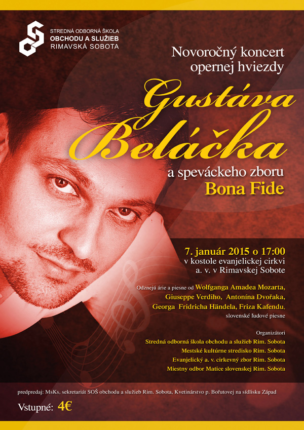 Do Rimavskej Soboty sa po roku opäť vráti špičkový operný spevák Gustáv Beláček, aj tentokrát sa postará o výnimočný novoročný koncert, spolu so speváckym zborom Bona Fide. V ich podaní odznejú árie a piesne od svetoznámych skladateľov ale aj slovenské ľudové piesne. Hviezda domáceho aj európskeho operného neba Gustáv Beláček príde do Rimavskej Soboty v stredu, 7. januára. Koncert sa uskutoční v evanjelickom kostole, o 17.00 hod. Podujatie aj tentokrát prináša Stredná odborná škola obchodu a služieb (SOŠOS).