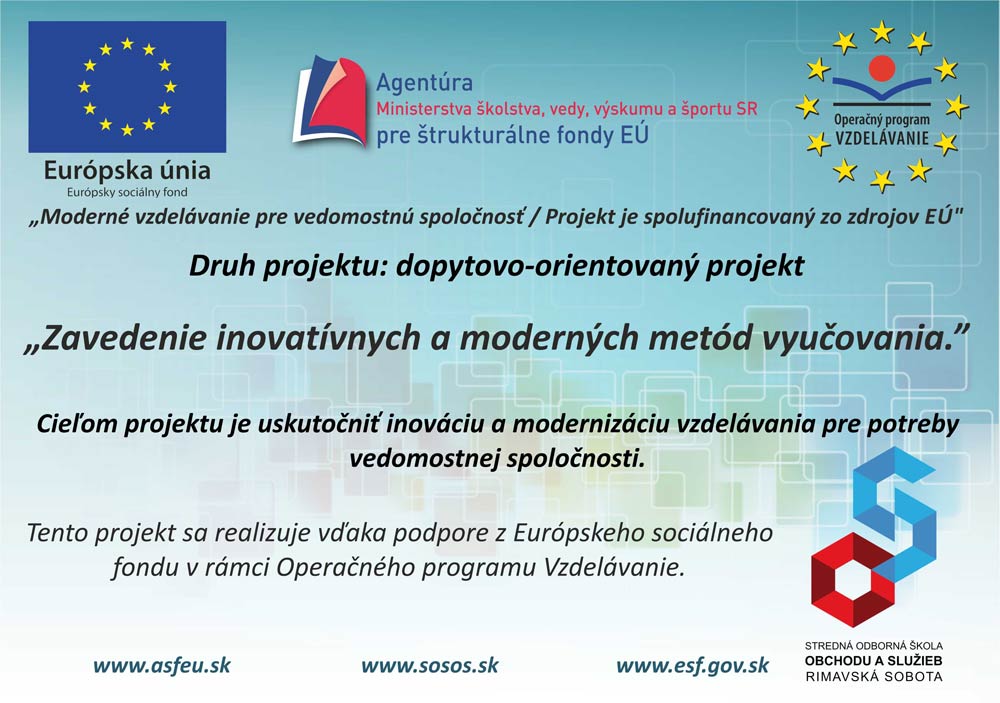 „Naša škola urobila opäť veľký krok k modernejšiemu vzdelávaniu. Projekt potrvá ešte do septembra budúceho roka a som rád, že sa nám darí napĺňať jeho hlavné ciele: inovovať obsah a metódy vzdelávacieho procesu, s dôrazom na potreby vedomostnej spoločnosti a tiež podporovať rozvoj kompetencií pedagógov,“ zhodnotil manažér projektu, riaditeľ Strednej odbornej školy obchodu a služieb v Rimavskej Sobote Jaroslav Bagačka. Ako spomenul, rozpočet projektu predstavuje viac ako 183 tisíc eur. Projekt je realizovaný vďaka podpore z Európskeho sociálneho fondu v rámci Operačného programu Vzdelávanie.