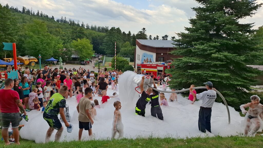 Záver ich programu patril jednej z najočakávanejších atrakcií – hasičskej pene. Dobrovoľní hasiči starostlivo pripravili všetko potrebné a keď prišiel správny čas, mohli sa deti s radosťou vrhnúť do hustej peny a dosýta sa vyblázniť.