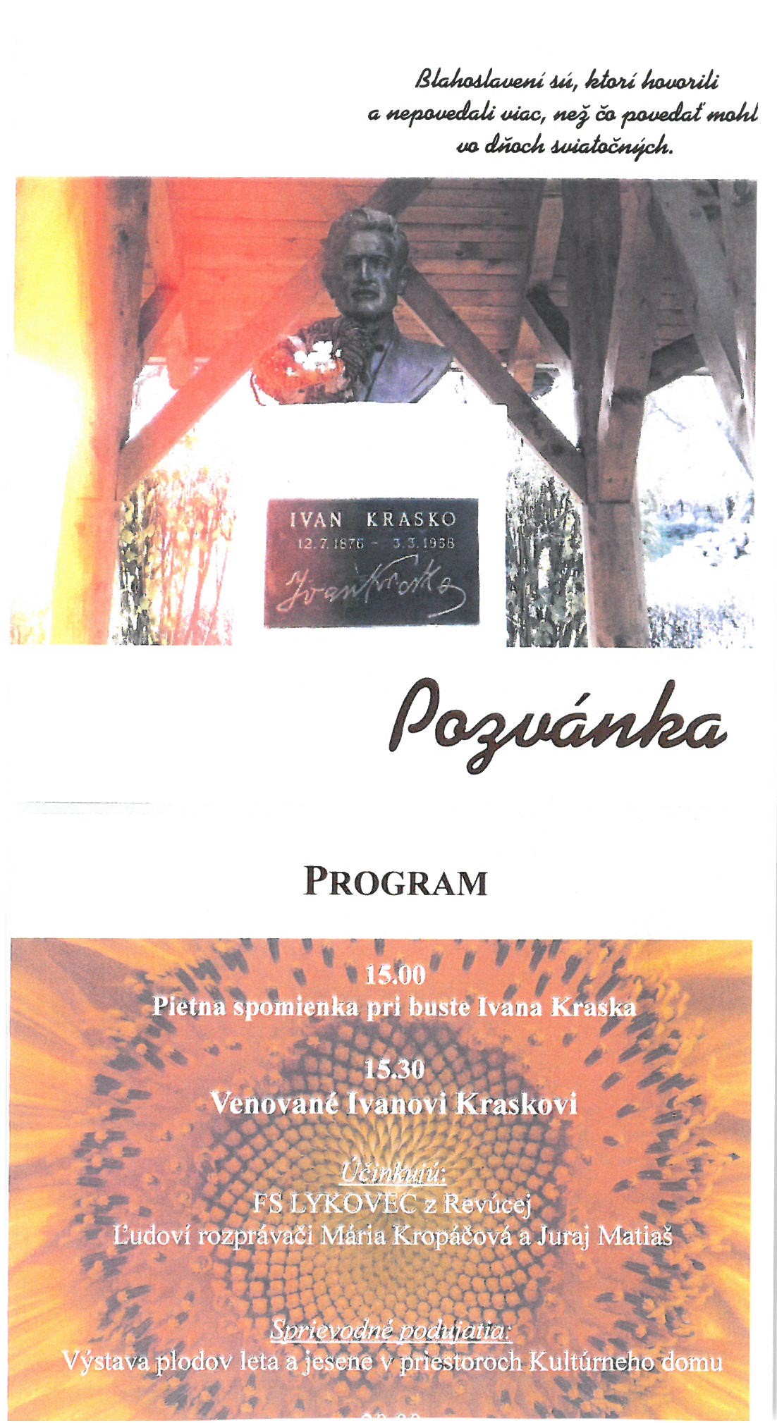 Sobota, 17. septembra, bude patriť trojici podujatí. To prvé si pripravil Klub slovenských turistov a ich kroky povedú od skorého rána do Západných Tatier na Sivý Vrch s príchodom v nedeľu, 18. septembra. Druhé podujatie je venované slivkám. V Mlyne vo Veľkých Teriakovciach sa uskutoční 4. ročník podujatia s názvom Slivkvé hody. Čaká na vás ukážka varenia slivkového lekváru v kotlíku, ochutnávka slivkových špecialít ako sú slivkové koláče, slivky v slanine, lokše so slivkovým lekvárom a rôzne iné. Nebude chýbať ochutnávka a predaj slivkového lekváru. No pochutnáte si aj na slivkových knedloch, chuťové poháriky potešia i pirohy a palacinky s lekvárom či koštovka „tekutých“ sliviek. V Dome kultúry v obci Bottovo si v prvý víkendový deň pripomenú 140. výročie narodenia Ivana Kraska. Na tomto kultúrno-spoločenskom podujatí vystúpia z Folklórného súboru Lykovec z Revúcej i ľudoví rozprávači Mária Kropáčová a Juraj Matiaš. Sprievodným podujatím bude výstava plodov leta a jesene.