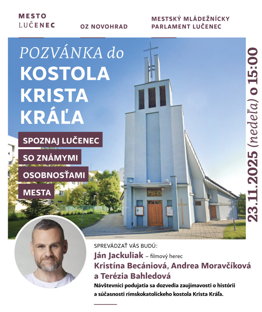 Mesto Lučenec v spolupráci s občianskym združením Novohrad a Mestským mládežníckym parlamentom pripravili na nedeľu 23. november 2025 ďalšie zo série podujatí Spoznaj Lučenec so známymi osobnosťami mesta. Tentokrát sa verejnosti predstaví rímskokatolícky kostol Krista Kráľa na sídlisku Rúbanisko v Lučenci.