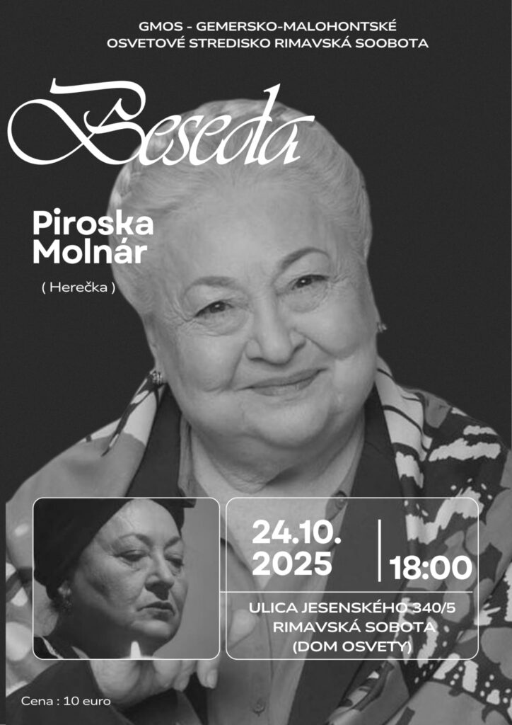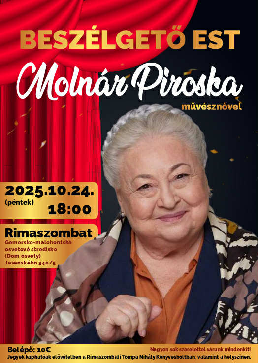 Molnár Piroska zavíta v piatok 24. októbra 2025 o 18:00 do Gemersko-malohontského osvetového strediska v Rimavskej Sobote, kde nás čaká večer plný emócií, humoru a životných príbehov.