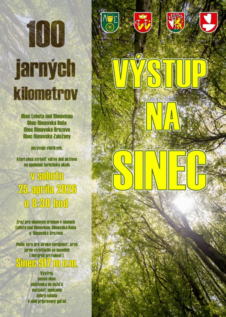 Milovníci prírody a turistiky si už čoskoro prídu na svoje. Obce Lehota nad Rimavicou, Rimavská Baňa, Rimavské Brezovo a Rimavské Zalužany pripravujú spoločné podujatie pod názvom „Výstup na Sinec“, ktoré sa uskutoční v sobotu 25. apríla 2026 o 8.30 hod.