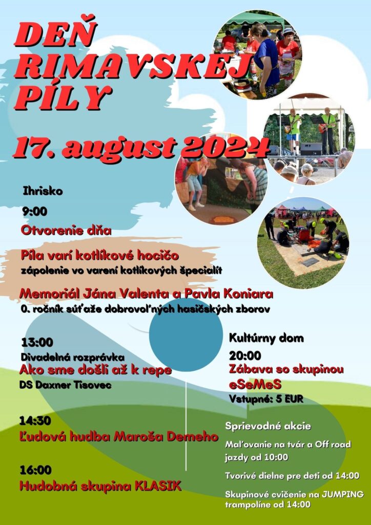 RIMAVSKÁ PÍLA - Obec Rimavská Píla chystá oslavu dňa Rimavskej Píly, ktorá sa uskutoční 17. augusta 2024. Program sa začne o 9:00 na miestnom ihrisku.