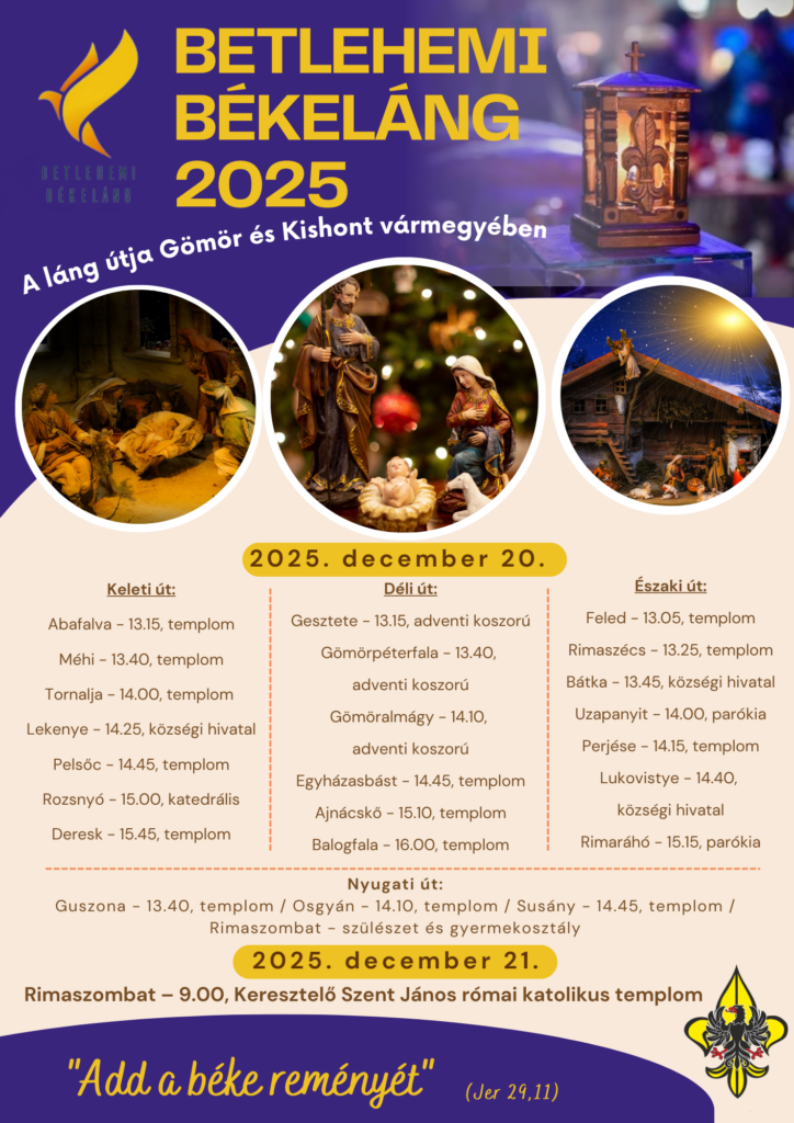 Aj tento rok prinesú skauti do miest a obcí Gemera-Malohontu plamienok Betlehemského svetla – symbol mieru, spolupatričnosti a tichej radosti, ktorá sa šíri pred Vianocami. Tradičná „Cesta svetla“ sa uskutoční 20. a 21. decembra 2025 a zahŕňa štyri trasy, počas ktorých si obyvatelia budú môcť prevziať svetlo z Betlehema vo svojich kostoloch či obecných úradoch.