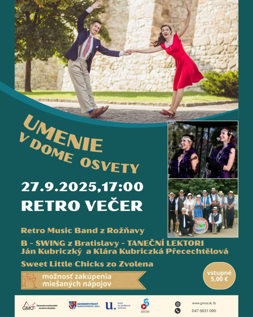 Hudba, spev a tanec, aké si pamätajú naše staré gramofóny a tanečné sály! Dom osvety v Rimavskej Sobote vás pozýva v sobotu 27. septembra 2025 o 17:00 na jedinečný RETRO večer, ktorý prinesie závan elegancie i energie z minulých dekád.