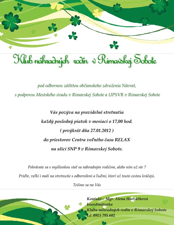 Aj preto v Rimavskej Sobote pracuje Klub náhradných rodín, pod odbornou záštitou občianskeho združenia Návrat, s podporou úradu práce, mestského úradu a aktívnou účasťou dobrovoľníkov. V roku 2012 sa náhradní rodičia po prvýkrát stretnú už tento piatok, 27. januára, v priestoroch Centra voľného času Relax v Rimavskej Sobote. Činnosť klubu podľa slov vedúcej oddelenia otvára priestor získať odbornú pomoc pre dospelých, ktorí už cestou náhradného rodičovstva kráčajú, ale aj pre tých, ktorí sa s myšlienkou stať sa náhradným rodičom ešte len pohrávajú.