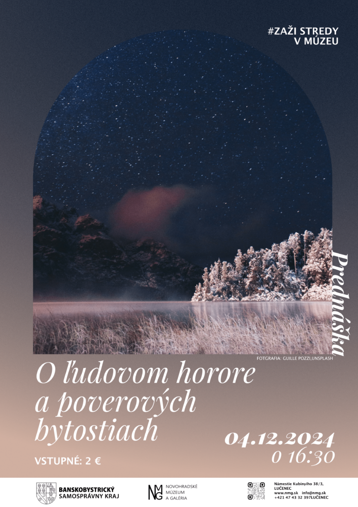 LUČENEC - Novohradské múzeum a galéria (NMG) v Lučenci, kultúrna inštitúcia Banskobystrického samosprávneho kraja, pripravuje ďalšie zaujímavé podujatie v rámci cyklu „Zaži stredy v múzeu“. Tentoraz sa 4. decembra o 16.30 uskutoční prednáška s názvom „O ľudovom horore a poverových bytostiach“.