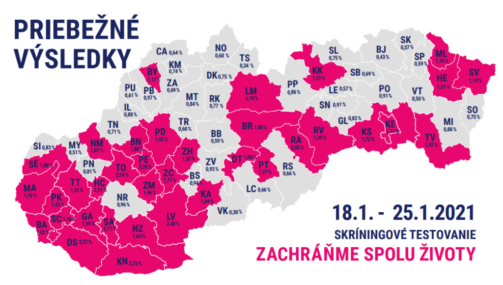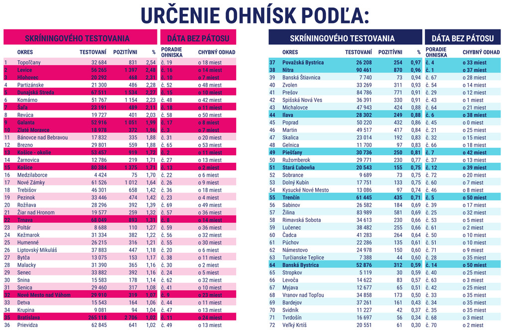 Medzi najlepšie okresy priebežne patria Veľký Krtíš, Tvrdošín a Svidník. Medzi najhoršími okresmi sú Topoľčany, Levice a Hlohovec, ktoré majú priebežne mieru pozitivity nad dve percentá.