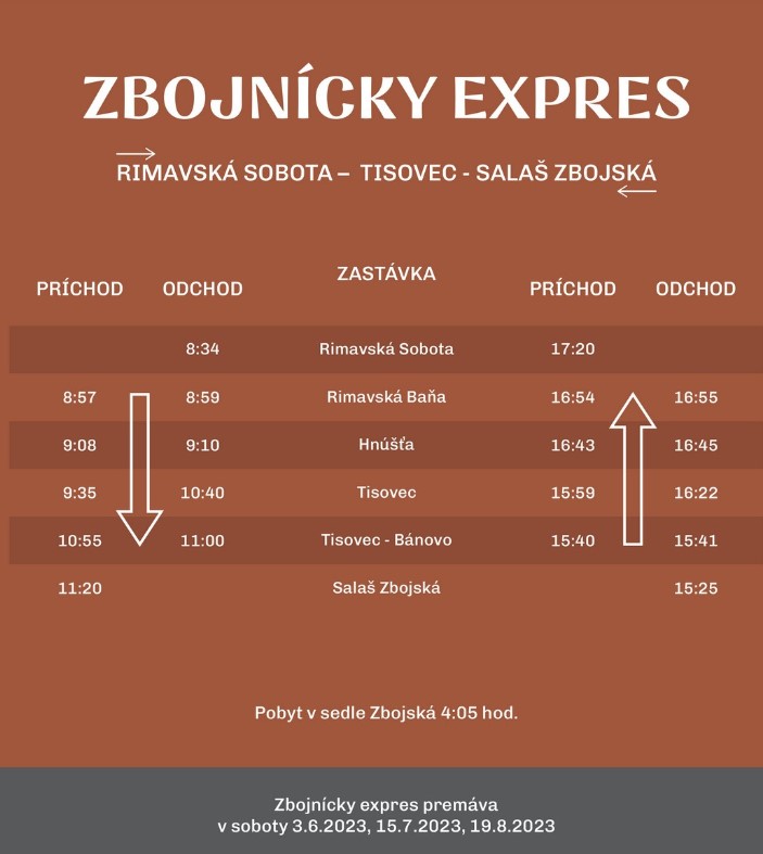 Jazda začne v Rimavskej Sobote a bude pokračovať cez Hnúšťu a Tisovec do sedla Zbojská. Spoznáte zbojnícke chodníčky v kraji zbojníka Jakuba Surovca, po ktorých sa neraz prechádzal aj legendárny Juraj Jánošík pri cestách do gemerskej stolice. Prežite s rodinou deň v príjemnej atmosfére Zbojníckeho expresu, kde na vás budú čakať mnohé prekvapenia.