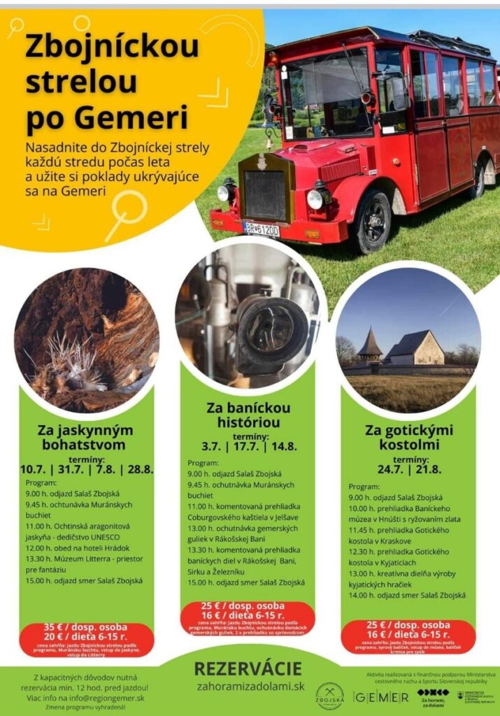 Už toto leto môžu malí i veľkí návštevníci Gemera bližšie spoznávať náš kraj aj vďaka zážitkovým jazdám na Zbojníckej strele. Červený autobus ponúka tri tematické trasy, každú s vlastným bohatým programom. Prvá trasa bude v stredu,10. júla, nazvaná Za jaskynným bohatstvom, zahŕňa návštevu Ochtinskej aragonitovej jaskyne, ktorá je zároveň dedičstvom UNESCO, ochutnávku miestnych Muránskych buchiet a interaktívne expozície v novom múzeu Litterra.