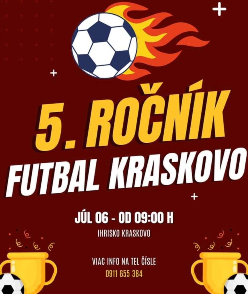 Priaznivci futbalu si 6. júla prídu na svoje v obci Kraskovo, ktorá vás srdečne pozýva na 5. ročník futbalového turnaja o pohár starostu obce. Turnaj sa uskutoční na miestnom futbalovom ihrisku a začne sa o 9:00. Príďte podporiť svoje obľúbený tím, užiť si skvelú športovú atmosféru, stráviť príjemný deň plný futbalových zážitkov a zábavy pre celú rodinu.