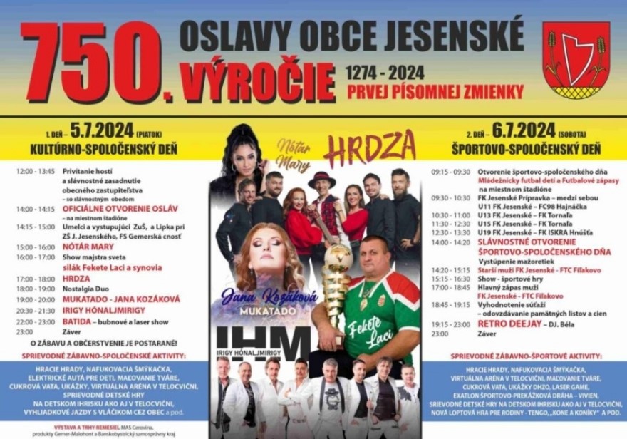 Pri príležitosti 750. výročia prvej písomnej zmienky o obci Jesenské sa uskutočnia oslavy Dňa obce. Počas slávností, ktoré sa budú konať v dňoch 5. a 6. júla, čaká návštevníkov kultúrno-spoločenský a športovo-spoločenský deň. Súčasťou programu je po oba dni i množstvo sprievodných atrakcií.