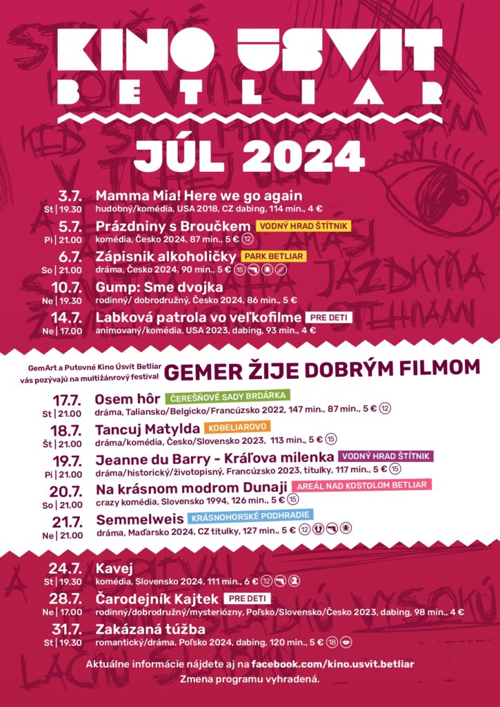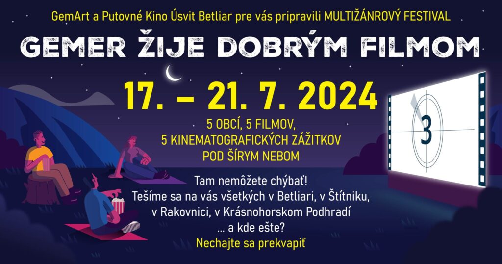 Podujatie Gemer žije dobrým filmom je multižánrový festival, ktorý sa koná od 17. do 21. júla v piatich obciach. V areáli nad kostolom Betliar letné kino začína 20. júla o 21.00.