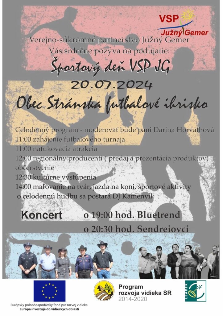 Obec Stránska organizuje 20. júla Športový deň VSP JG. Celodenný program bude na futbalovom ihrisku a začne o 11.00. Súčasťou podujatia sú i večerné koncertné vystúpenia.