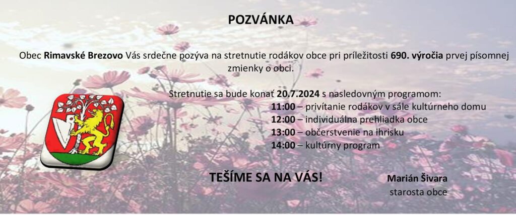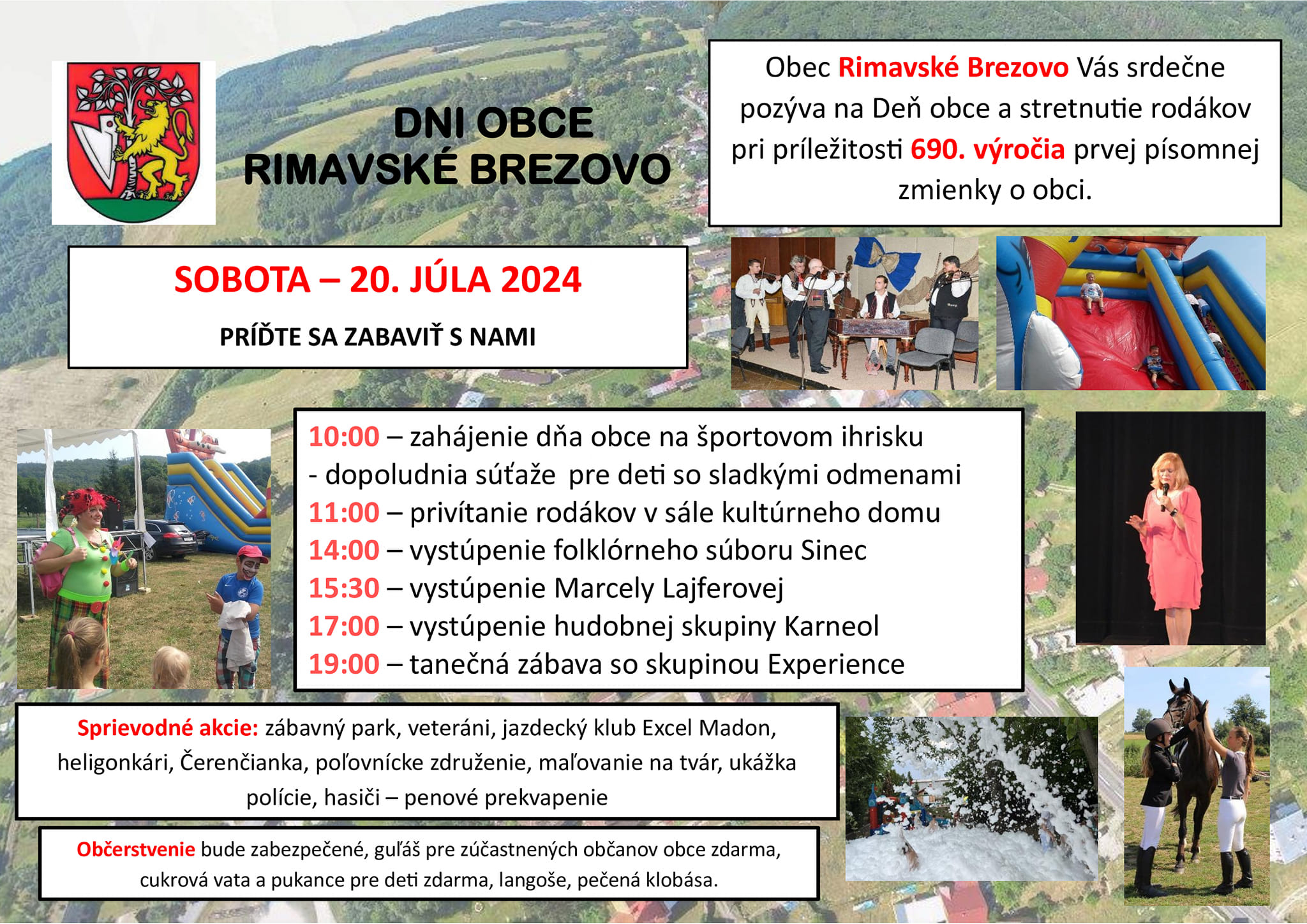 V sobotu (20. júla) sa uskutočnia Dni obce Rimavské Brezovo, ktoré privítajú rodákov a pripomenú si 690-te výročie prvej písomnej zmienky o obci. Pripravený je bohatý sprievodný program i folklórne vystúpenia, začiatok podujatia je o 10.00.
