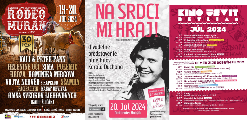 Najväčšie a najstaršie ródeo v Európe sa už po tridsiatykrát bude konať pri obci Muráň v okrese Revúca. Podujatie sa začne v piatok 19. júla a bude pokračovať až do soboty 20. júla. Návštevníci sa môžu tešiť na krásne kone, najlepších ródeo jazdcov, množstvo koncertov, kolotoče a iné atrakcie. Samozrejme, nebude chýbať ani výborné jedlo a chladené nápoje, ktoré spríjemnia horúce letné dni.