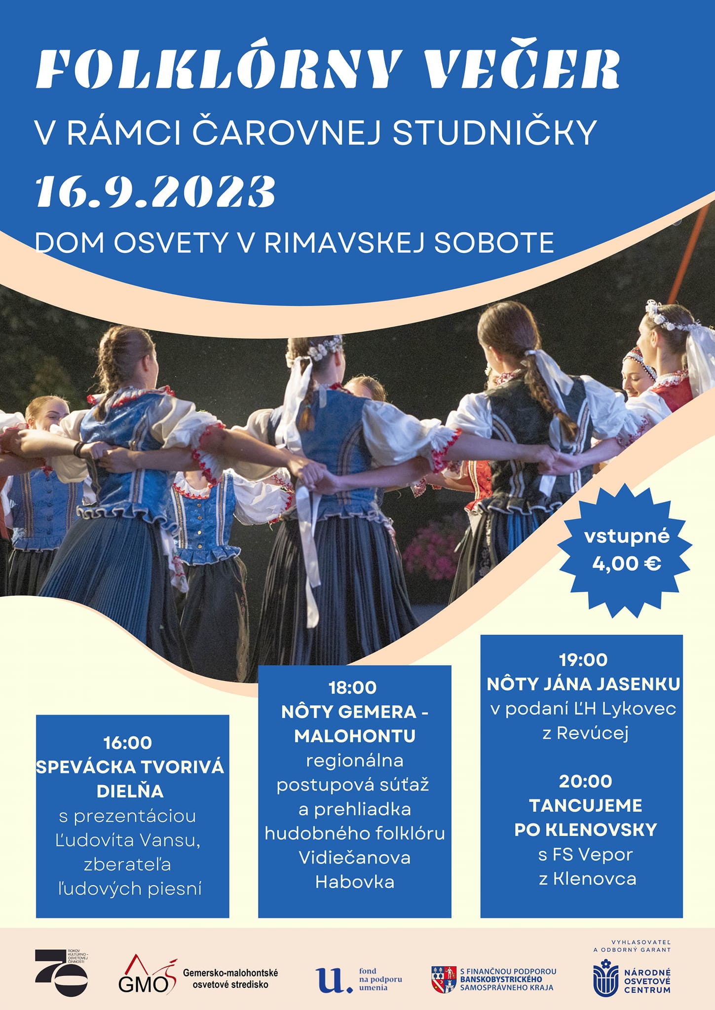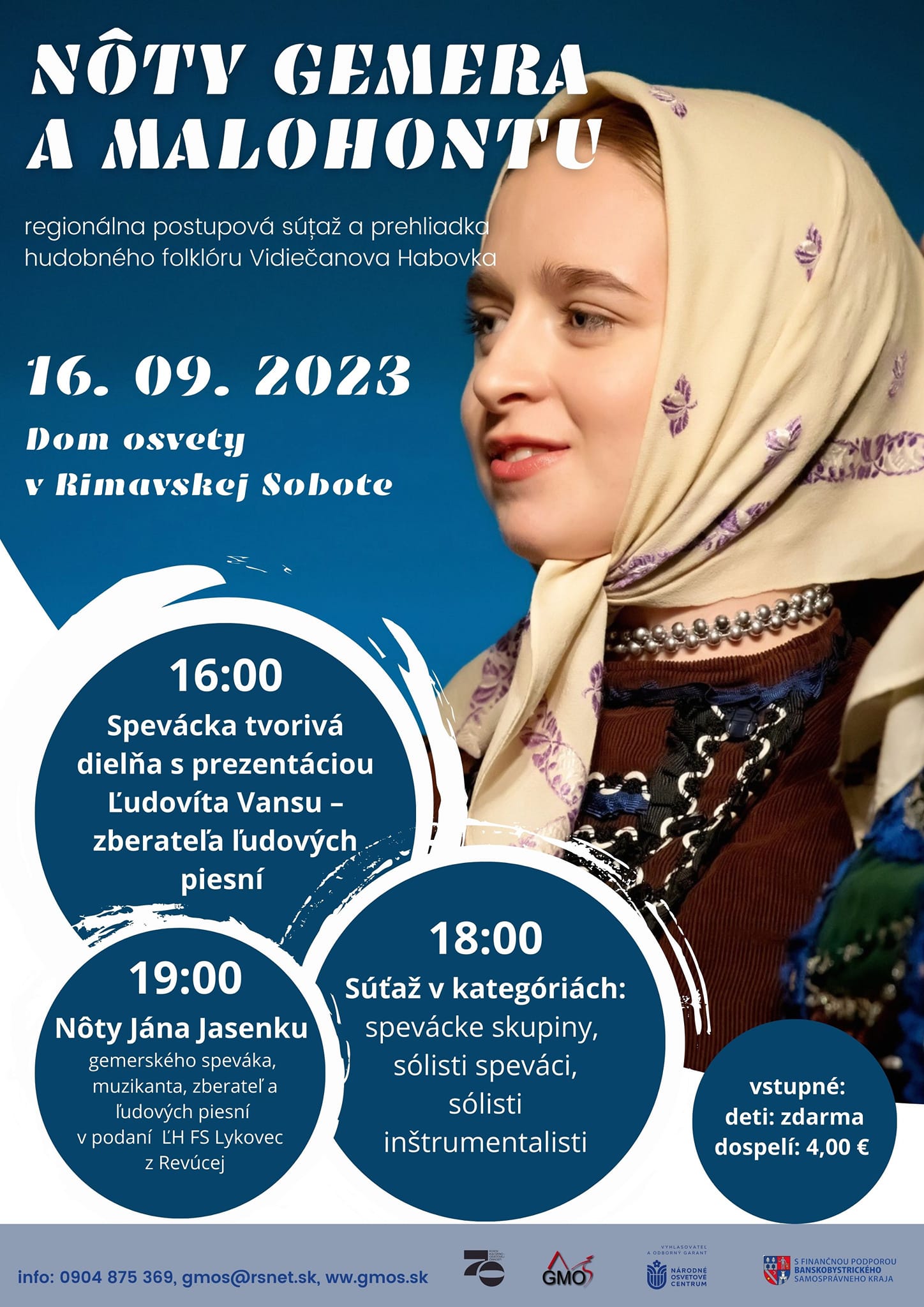 Od 16:00 hod. bude prezentovaná zberateľská činnosť Ľudovíta Vansu a budete sa môcť naučiť ľudové piesne z jeho zbierky. V rámci večerného programu v spolupráci s FS Lykovec a FS Vepor, priblížia spomienky na muzikanta, speváka, zberateľa ľudových piesní stredného Gemera Jána Jasenku.