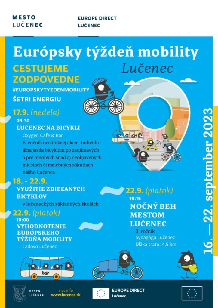 Európsky týždeň mobility sa v Lučenci začne už v nedeľu 17. septembra. 6. ročník podujatia Lučenec na bicykli, sa uskutoční v spolupráci so samosprávou a organizuje ho OZ Mesto na bicykli. Akcia je určená pre všetkých rekreačných cyklistov, ktorí zdolajú ulice a možno aj ešte nepoznané zákutia mesta. Na pláne majú napríklad aj návštevu niekoľkých miestnych firiem.