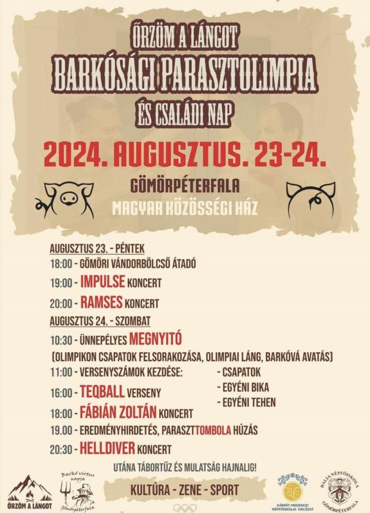 Podujatie „Őrzöm a lángot – Barkósági parasztolimpia és családi nap“, ktoré sa uskutoční 23. a 24. augusta 2024 v Gömörpéterfale, prinesie dva dni plné kultúry, hudby a športu. Program zahŕňa koncerty skupín Impulse, Ramses, Fábián Zoltán a Helldiver, ako aj rôzne súťaže, vrátane populárneho teqballu. Akcia vyvrcholí slávnostným otvorením s olympijským ohňom a tradičným „parasztolimpiou“. Pre návštevníkov je pripravená aj tombola a nočná zábava pri táborovom ohni. Celé podujatie je zamerané na podporu tradičných hodnôt a posilnenie miestnej komunity.