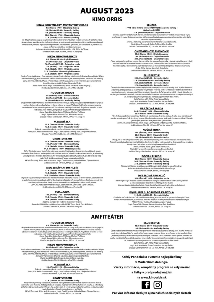 Aj v auguste pokračuje premietanie na rimavskosobotskom amfiteátri. Premietania sa začínajú vždy o 21:10. Tento mesiac si môžete pod holým nebom pozrieť filmy Hovor so mnou!, Nikdy nehovor nikdy, V zajatí zla, Gran Turismo a Blue Beetle.